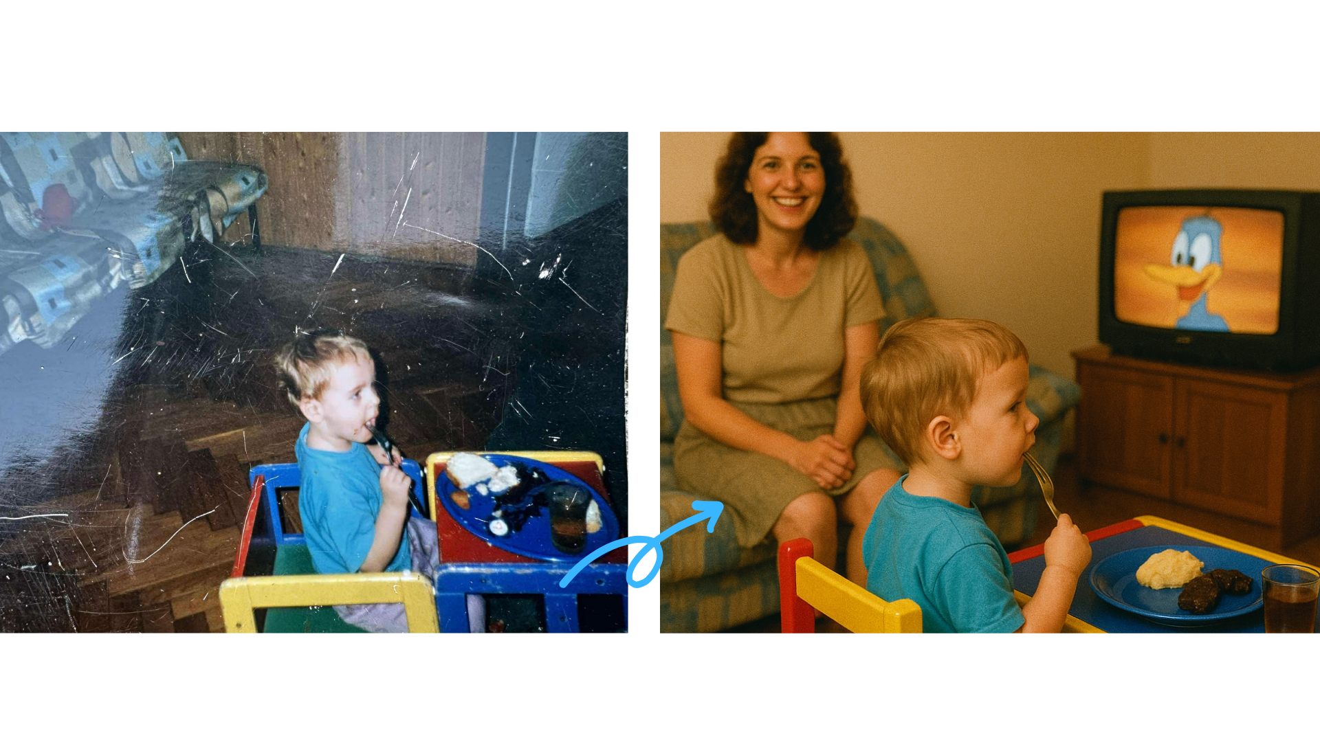 Az SOS Gyermekfalu kampányában vizuális kontraszttal mutatja meg azt a párhuzamos valóságot, ami lehetett volna, ha kellő figyelem van a széthullás előtt álló családokon a rendszer részéről, nagyobb hangsúly a prevención és a családmegerősítésen. Míg az eredeti fotókon a gyermekvédelmi gondoskodásban felnőtt fiatalok gyerekkorából láthatunk epizódokat, a párhuzamos valóság fotóján az AI a régi emléket egészíti ki olyanná, amilyet a fiatal gyermekként valójában szeretett volna.