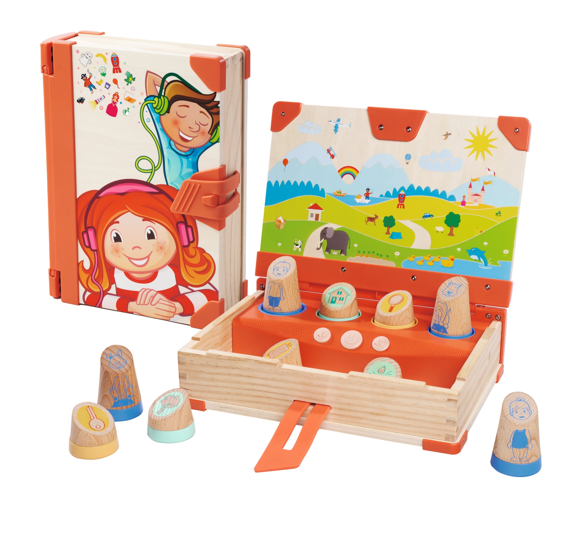 Ez a fából készült interaktív hangoskönyv nem csak elmondja a meséket, hanem bevonja a gyermeket a történet „megalkotásába” - apró fafigurák segítségével a kicsik maguk döntik el, hogy mikor melyik szereplők és tárgyak bukkanjanak fel a mesében, így minden alkalommal más és más történet születik.